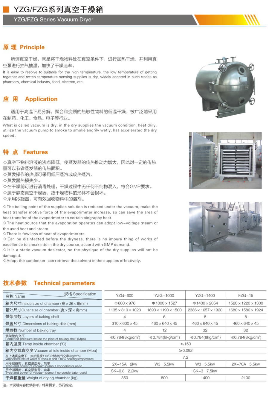 YZG/FZG系列真空干燥機屬于靜態(tài)真空干燥機,該干燥設備將被干燥物料處于真空條件下進行加熱,并利用真空泵進行抽氣抽濕,使工作室處于真空狀態(tài),物料的干燥速率大大加快,同時也節(jié)省了能源。如采用冷凝器,物料中的溶劑可通過冷凝器加以回收,如溶劑為水,可不用冷凝器,節(jié)省能源投資。