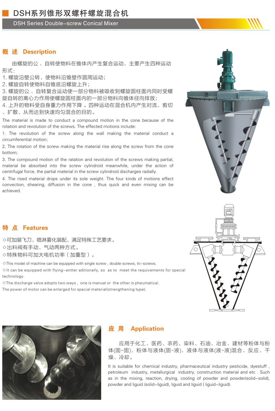 DSH雙螺桿錐形混合機(jī)是一種新型、高效、高精度的混合設(shè)備,廣泛適用于制藥、化工、飼料等行業(yè)的各種粉狀物料的混合。
