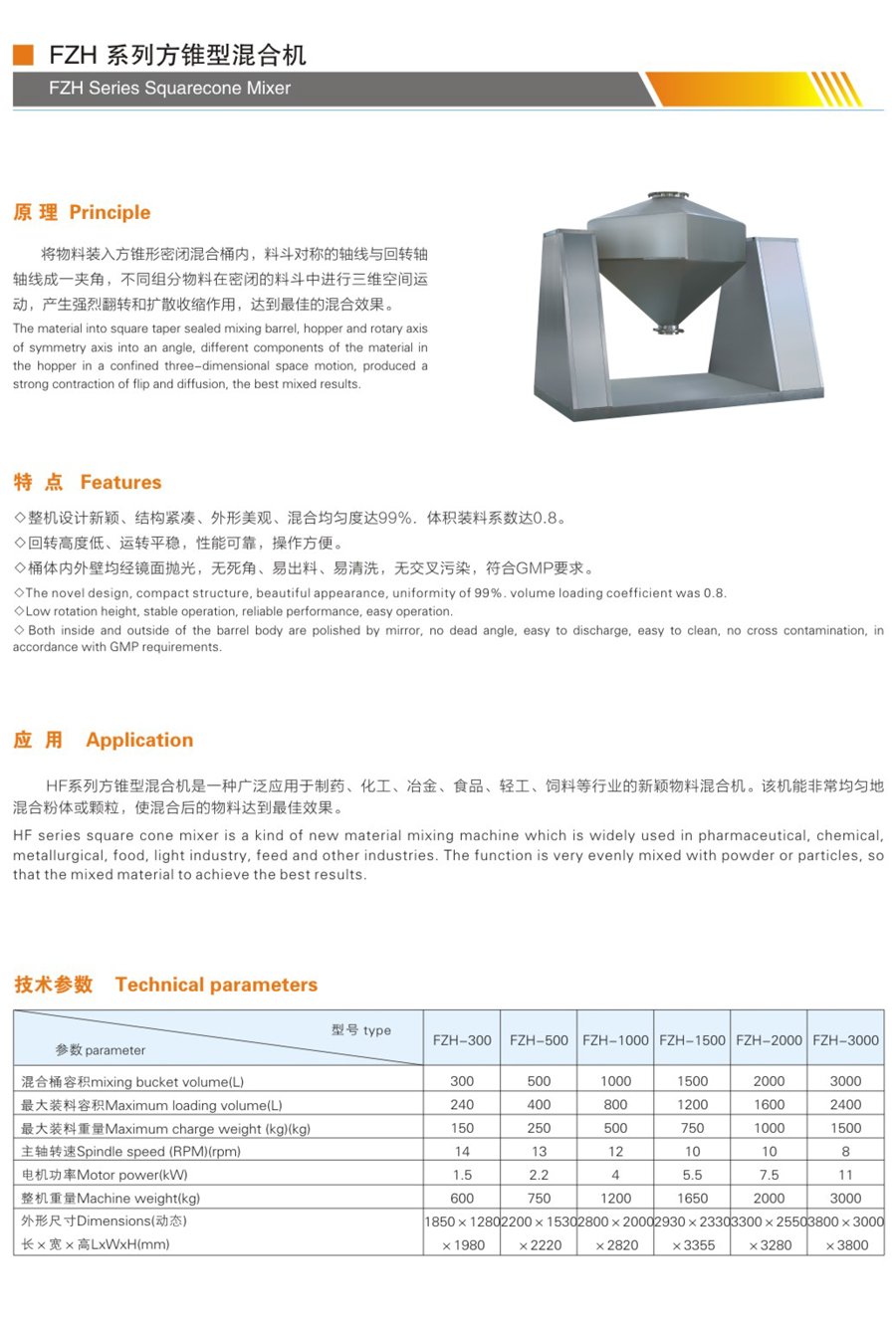 方錐混合機 FH系列方錐型混合機是一種廣泛應(yīng)用于制藥、化工、冶金、食品、輕工、飼料等行業(yè)的新穎物料混合機。該機能非常均勻地混合粉體或顆粒,使混合后的物料達到最佳效果。