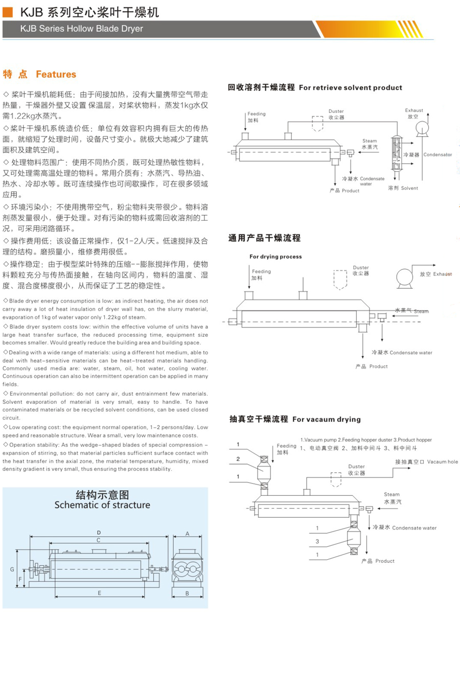 空心軸上密集排列著楔型中空槳葉,熱介質(zhì)經(jīng)空心軸流經(jīng)槳葉。單位有效容積內(nèi)傳熱面積很大,熱介質(zhì)溫度從-40℃到320℃,可以是水蒸汽,也可以是液體型:如熱水、導(dǎo)熱油等。間接傳導(dǎo)加熱,沒有攜帶空氣帶走熱量,熱量均用來加熱物料。熱量損失僅為通過器體保溫層向環(huán)境的散熱。楔型 槳葉傳熱面具有自清潔功能。物料顆粒與楔型面的相對運動產(chǎn)生洗刷作用,能夠洗刷掉楔型面上附著物料,使運轉(zhuǎn)中一直保持著清潔的傳熱面。槳葉干燥機的殼體為W型,殼體內(nèi)一般安排二到四根空心攪拌軸。殼體有密封端蓋與上蓋,防止物料粉塵外泄及收集物料溶劑蒸汽。出料口處設(shè)置一擋扳,保證料位高度,使傳熱面被物料覆蓋而充分發(fā)揮作用。熱介質(zhì)通過旋轉(zhuǎn)接頭,流經(jīng)殼體夾套及空心攪拌軸,空心攪拌軸依據(jù)熱介質(zhì)的類型而具有不同的內(nèi)部結(jié)構(gòu),以保證最佳的傳熱效果。